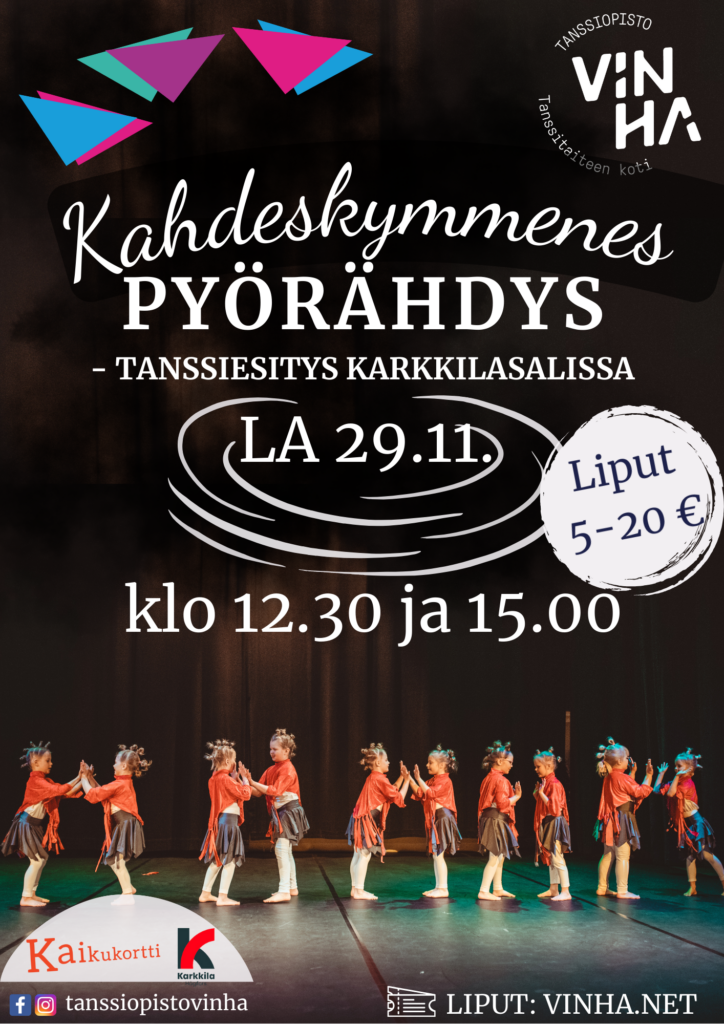 Kahdeskymmenes pyörähdys! -näytös tanssitaan Karkkilasalissa lauantaina 29.11. klo 12.30 ja 15. Lataa tästä itsellesi näytösten käsiohjelmat talteen!